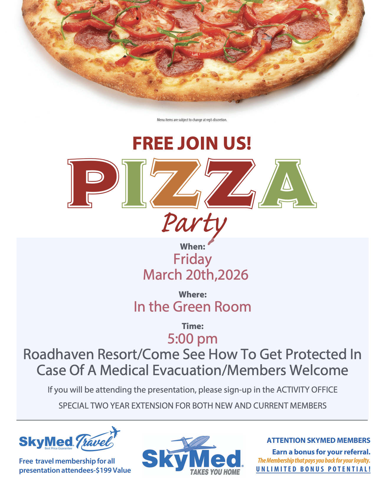 Residents are invited to a complimentary pizza party and informational seminar hosted by SkyMed.