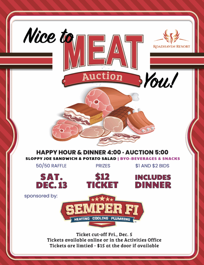Patio Sale signups are open in the Activities Office. The December Community-Wide Patio Sale will run from 8 AM to noon. Please remember that Roadhaven does not pick up leftover sale items. Be sure to plan ahead and arrange for your own removal or donation.