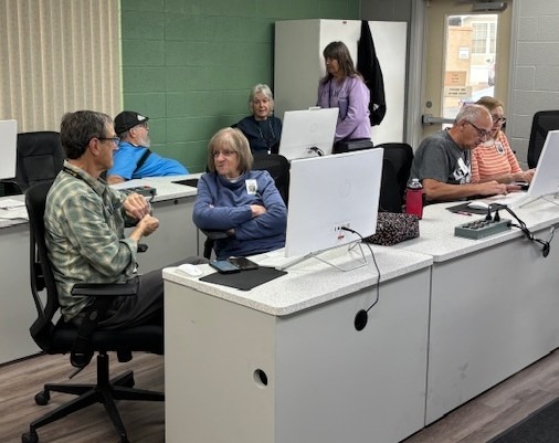 The lab door is kept locked, and members may enter during open hours with the electronic access code they are provided when they join unless there is a class scheduled. Lab is equipped with copier, printer, and scanner, all available for members with a nominal fee for printing. We offer Lab Orientation small group Sessions to help new members get acclimated to the lab.Â