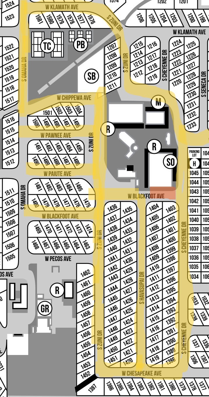 A small portion of Blackfoot Road will be temporarily closed while repairs are made at the south end of the Rec Hall. When the road is blocked, please follow the alternate routes provided. For everyone’s safety, we ask that you avoid the area until the work is complete.